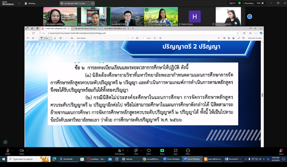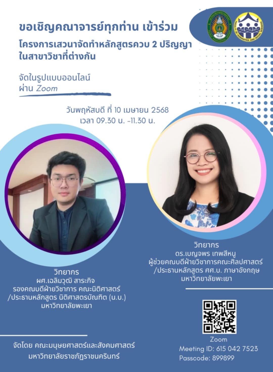 เมื่อวันพฤหัสบดีที่ 10 เมษายน 2568 ดร.เบญจพร เทพสีหนู ผู้ช่วยคณบดีคณะศิลปศาสตร์ และ ผู้ช่วยศาสตราจารย์ เฉลิมวุฒิ สาระกิจ รองคณบดีฝ่ายวิชาการ คณะนิติศาสตร์ มหาวิทยาลัยพะเยา ได้ร่วมเป็นวิทยากรในโครงการ “เสวนาการจัดทำหลักสูตรควบสองปริญญา ในสาขาวิชาที่ต่างกัน คณะมนุษยศาสตร์และสังคมศาสตร์ มหาวิทยาลัยราชภัฏราชนครินทร์” ในรูปแบบออนไลน์ เวลา 9.00-11.00 น. โดยมีการเสวนาเพื่อแลกเปลี่ยนเรียนรู้เกี่ยวกับการดำเนินการของหลักสูตรควบสองปริญญา หลักสูตรนิติศาสตรบัณฑิต และหลักสูตรศิลปศาสตรบัณฑิต สาขาวิชาภาษาอังกฤษ จัดกิจกรรมโดย คณะมนุษยศาสตร์และสังคมศาสตร์ มหาวิทยาลัยราชภัฏราชนครินทร์ มีวัตถุประสงค์เพื่อปรับปรุงพัฒนาหลักสูตรให้สอดคล้องตามกรอบมาตรฐานหลักสูตรควบ ระดับปริญญาตรี สองปริญญา และ หลักสูตรควบ ระดับปริญญาโท สองปริญญา ในสาขาวิชาที่ต่างกัน พ.ศ. 2565 และเพื่อปรับปรุงหรือพัฒนาหลักสูตรให้ทันสมัย สอดคล้องตามสถานการณ์ทางการศึกษา และสภาพสังคมที่เปลี่ยนแปลงไป ตลอดจนเพื่อปรับปรุงและพัฒนาหลักสูตรให้ตรงตามความต้องการของผู้ใช้บัณฑิต