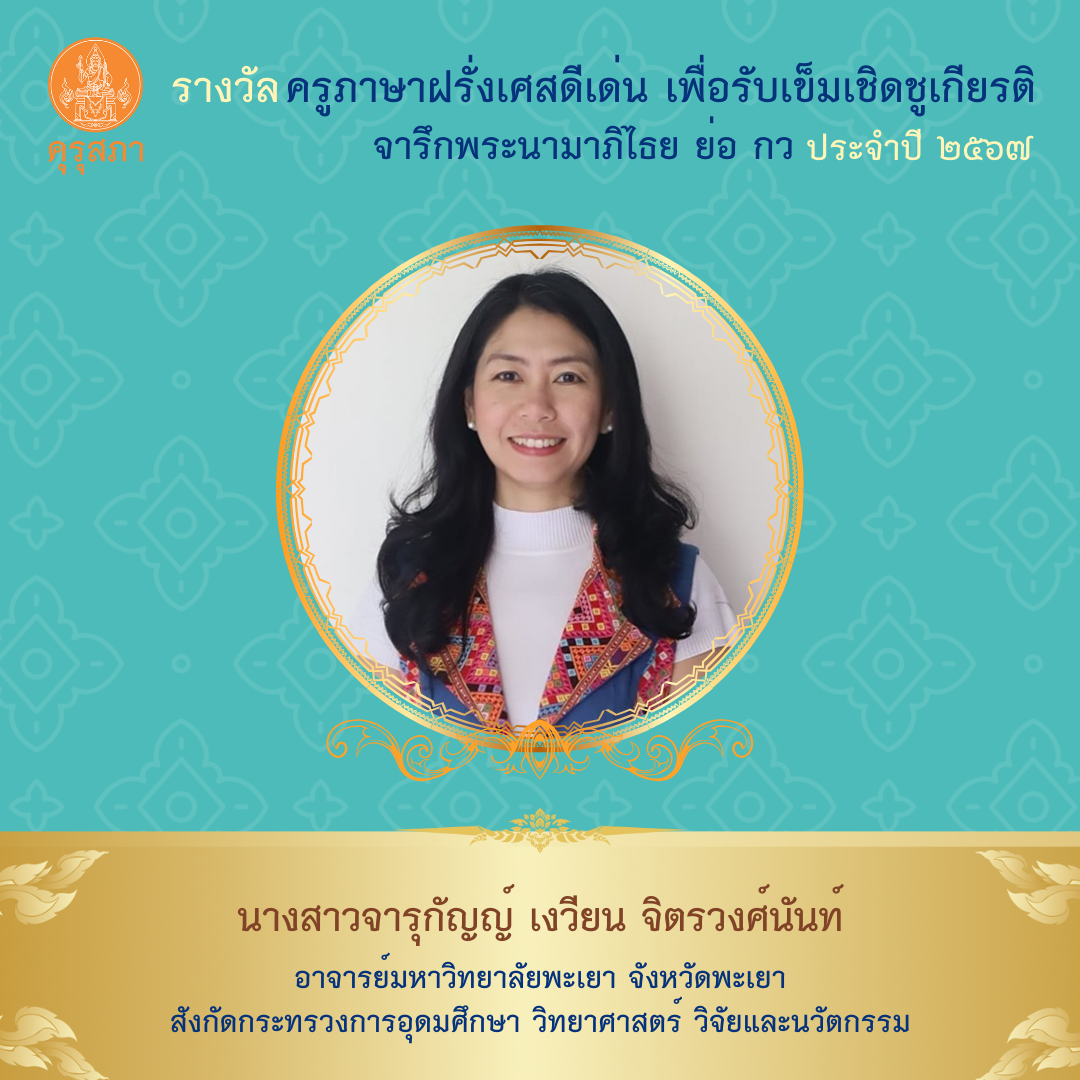 ดร.จารุกัญญ์ เงวียน จิตรวงศ์นันท์ ประธานหลักสูตร ศศ.บ. ภาษาฝรั่งเศส คณะศิลปศาสตร์ มหาวิทยาลัยพะเยา เข้ารับพระราชทานรางวัลครูภาษาฝรั่งเศสดีเด่น เพื่อรับเข็มเชิดชูเกียรติ จารึกพระนามาภิไธย ย่อ กว ประจำปี ๒๕๖๗ โดยเข้าเฝ้าทูลละอองพระบาท สมเด็จพระกนิษฐาธิราชเจ้า กรมสมเด็จพระเทพรัตนราชสุดาฯ สยามบรมราชกุมารี ณ วังสระปทุม กรุงเทพมหานคร