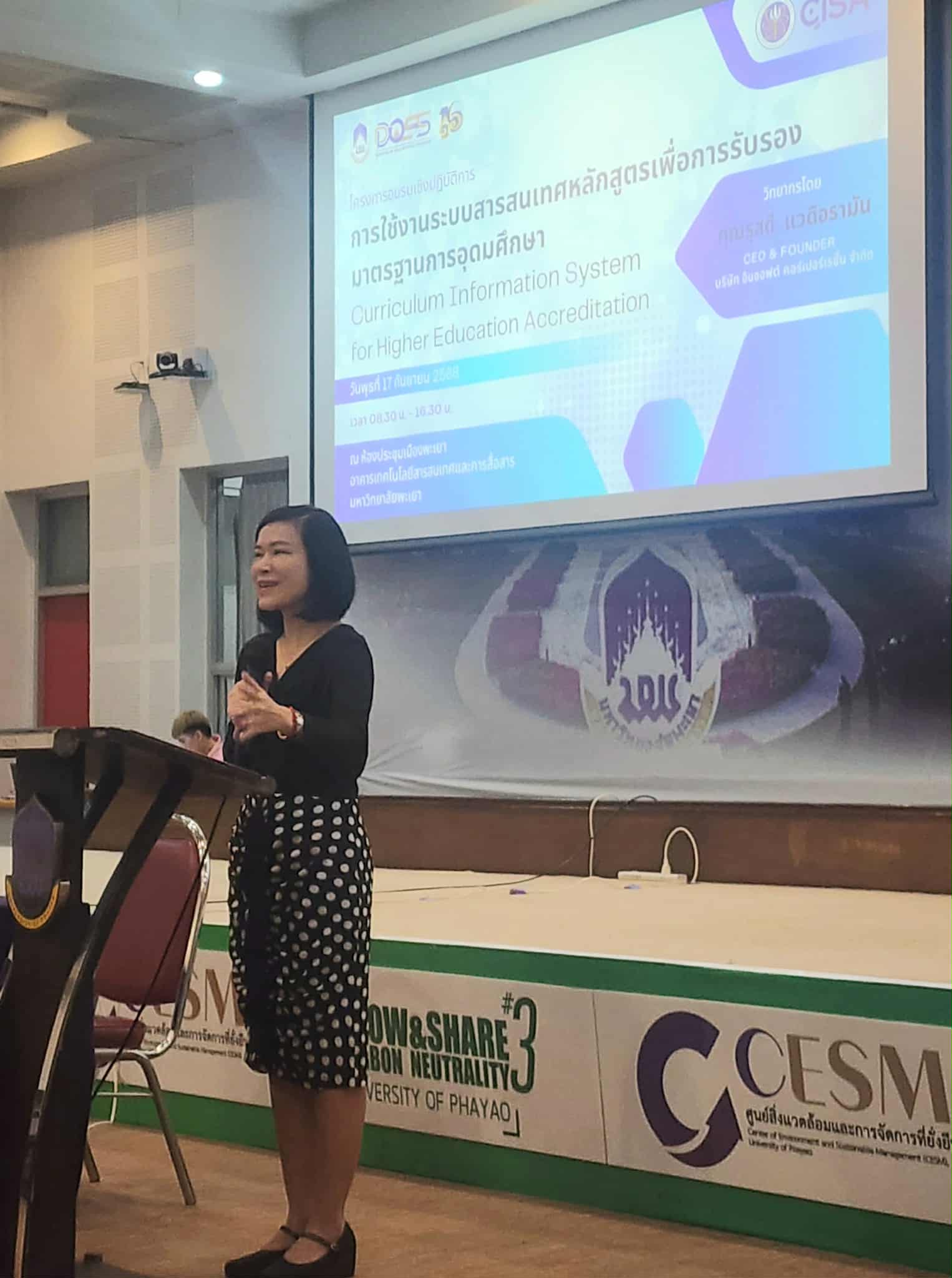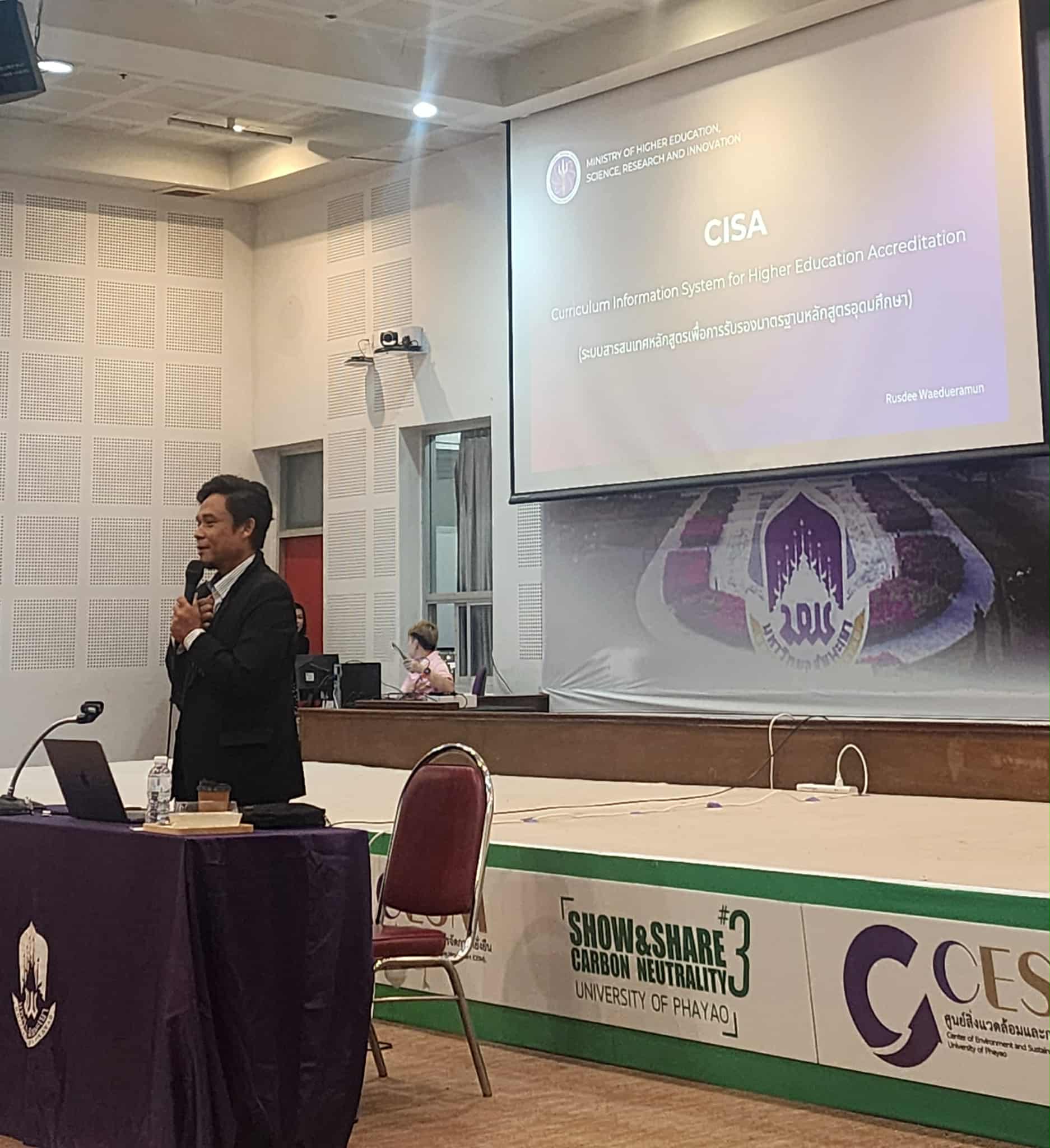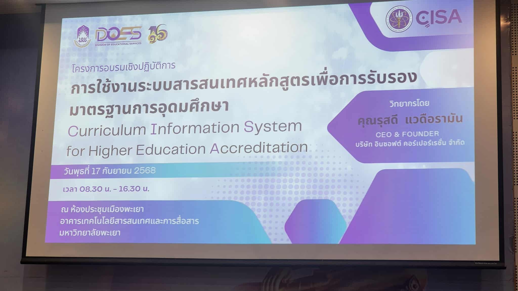 เมื่อวันพุธที่ 17 กันยายน 2568 กองบริการการศึกษา มหาวิทยาลัยพะเยา จัดโครงการอบรมเชิงปฏิบัติการ เรื่อง “การใช้งานระบบสารสนเทศหลักสูตรเพื่อการรับรองมาตรฐานการอุดมศึกษา (Curriculum Information System for Higher Education Accreditation: CISA)” โดยได้รับเกียรติจาก คุณรุสดี แวดือรามัน CEO & Founder บริษัท อินซอฟต์ คอร์เปอร์เรชั่น จำกัด เป็นวิทยากร ณ ห้องประชุมเมืองพะเยา อาคารเทคโนโลยีสารสนเทศ และผ่านสื่ออิเล็กทรอนิกส์ MS Teams