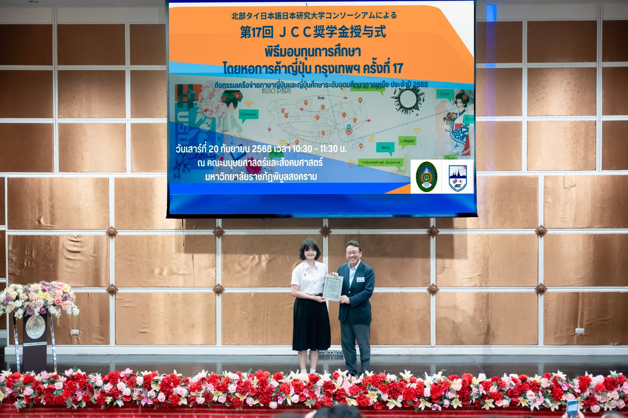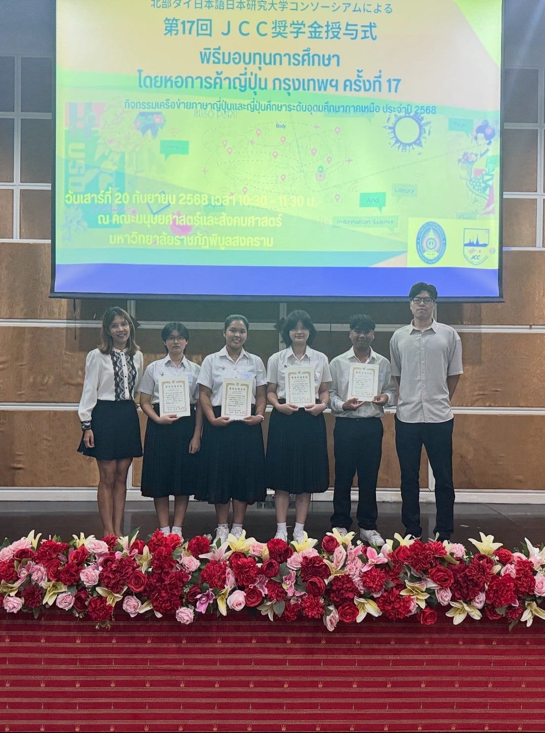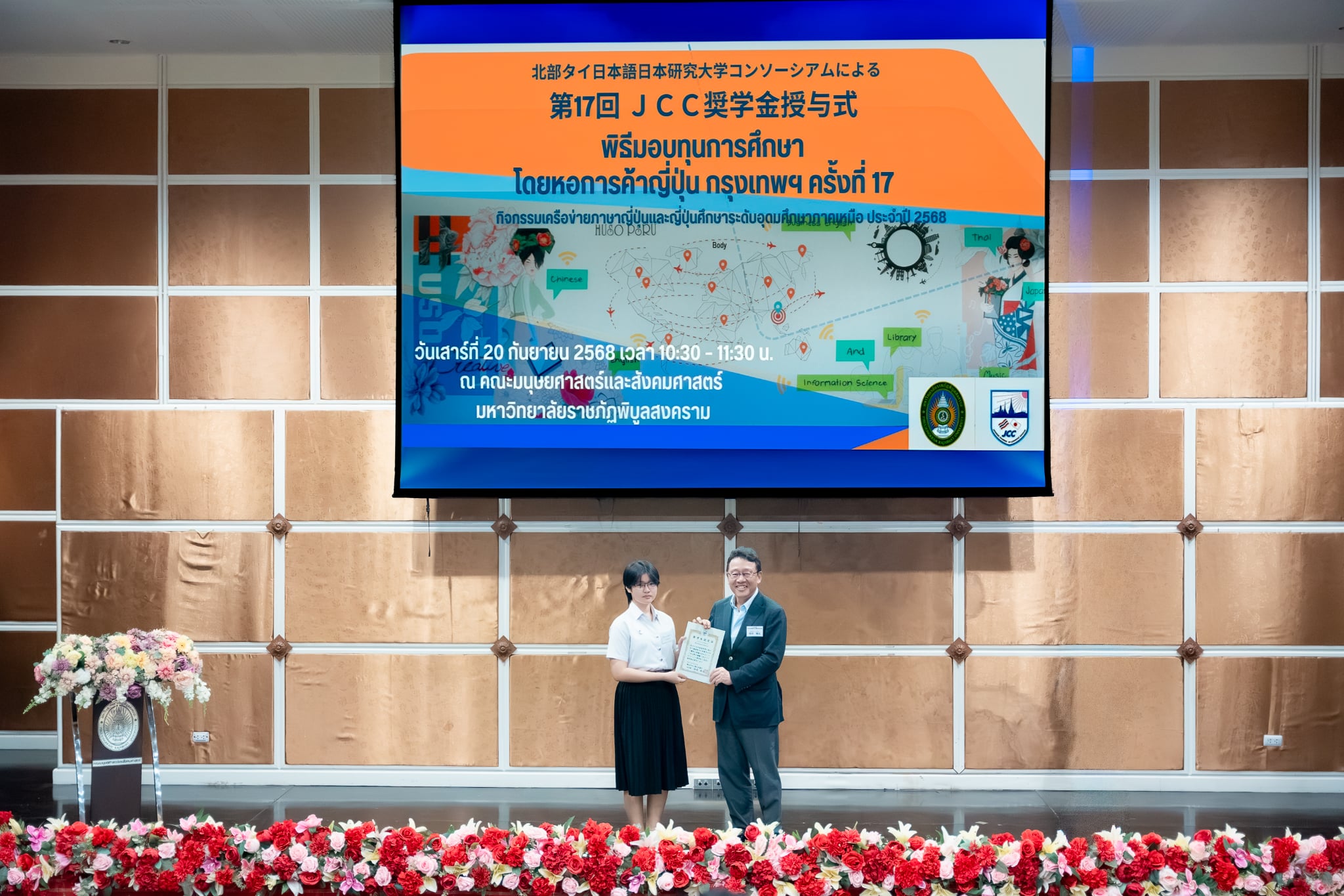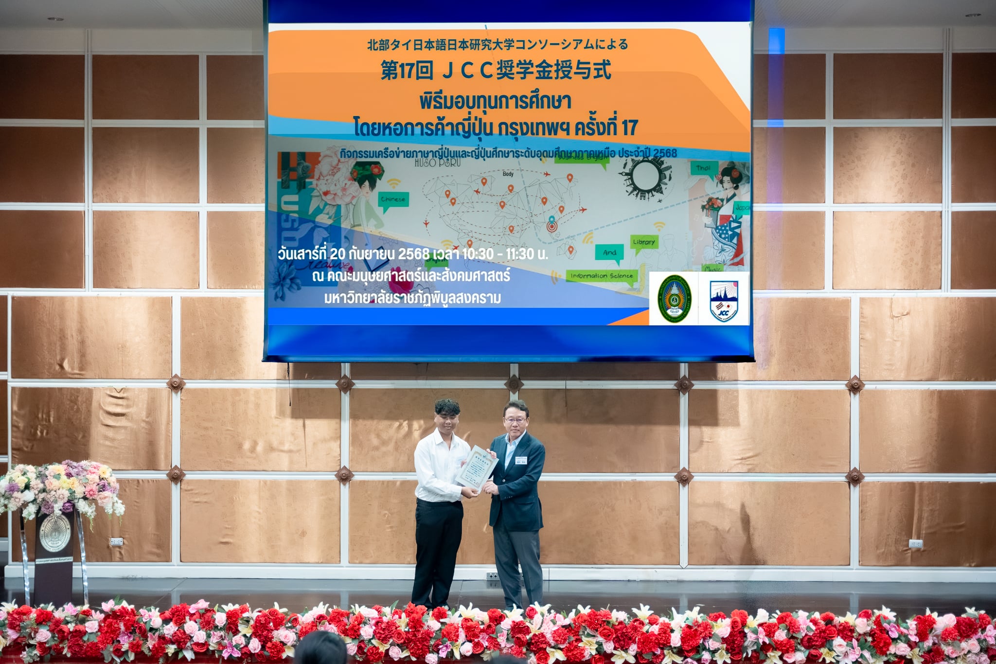 เมื่อวันเสาร์ที่ 20 กันยายน 2568 สาขาวิชาภาษาญี่ปุ่น คณะศิลปศาสตร์ มหาวิทยาลัยพะเยา ได้เข้าร่วม พิธีมอบทุนการศึกษา โดยหอการค้าญี่ปุ่น กรุงเทพฯ (JCC) ครั้งที่ 17 และ งานเสวนาญี่ปุ่นธุรกิจ ครั้งที่ 14 ซึ่งจัดขึ้นโดยเครือข่ายภาษาญี่ปุ่นและญี่ปุ่นศึกษา ระดับอุดมศึกษาภาคเหนือ (NTUCJ) ณ อาคารคณะมนุษยศาสตร์และสังคมศาสตร์ มหาวิทยาลัยราชภัฏพิบูลสงคราม (ส่วนทะเลแก้ว) จ.พิษณุโลก เพื่อเสริมสร้างเครือข่ายด้านการเรียนการสอนภาษาญี่ปุ่น ระดับอุดมศึกษาภาคเหนือ รวมถึงเพื่อเตรียมความพร้อมในการทำงานด้านธุรกิจญี่ปุ่นแก่นิสิต โดยมีนิสิตสาขาวิชาภาษาญี่ปุ่น ชั้นปีที่ 3 คณะศิลปศาสตร์ เข้ารับทุนการศึกษา จำนวน 4 ราย ประกอบด้วย 1) นางสาวชนาภา ทวีสัตย์ 2) นางสาวองค์อร สกุลแก้ว 3) นางสาวพรปวีณ์ ศรีเสริม และ 4) นายวชิรวิทย์ รักเวช