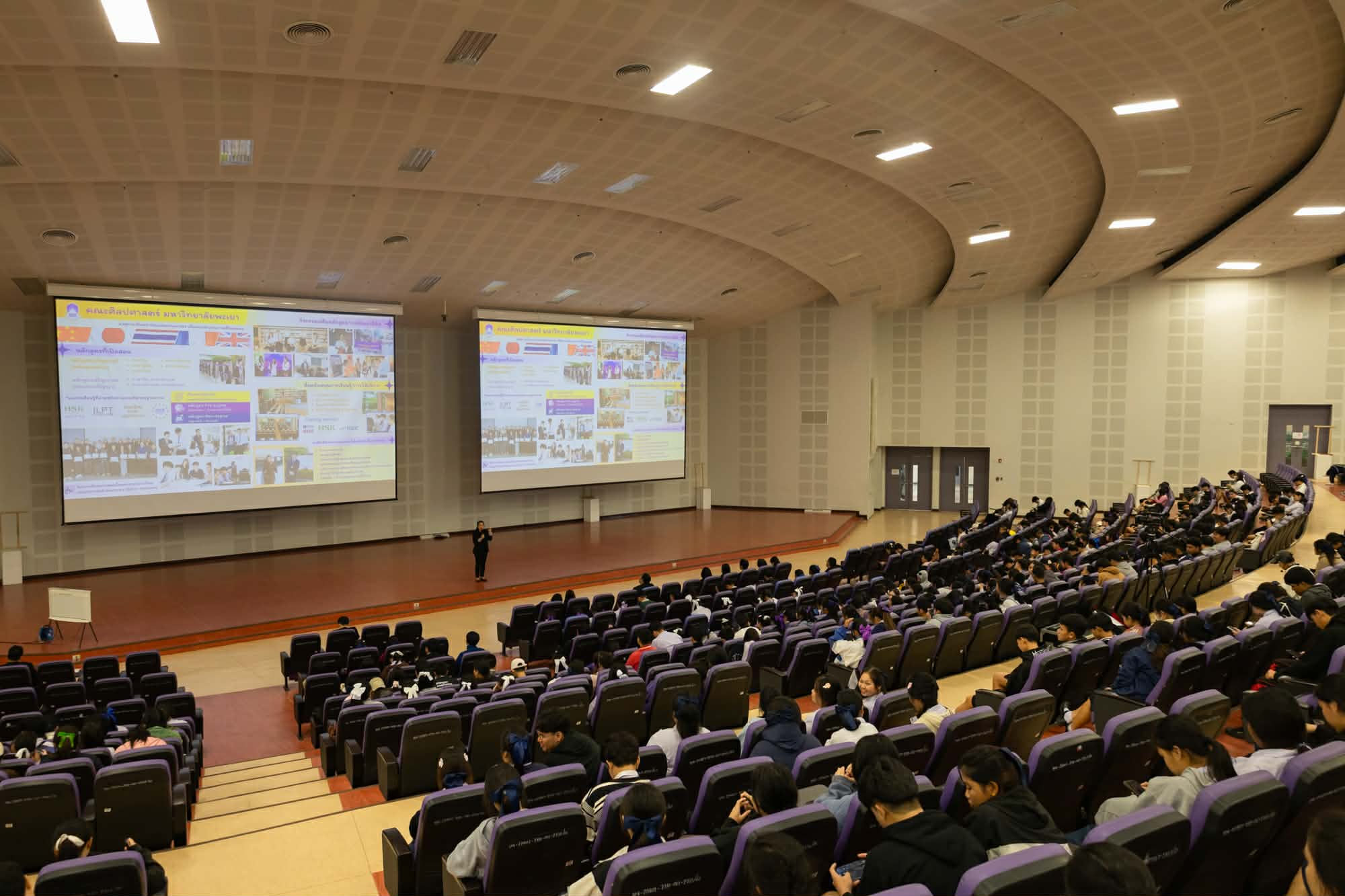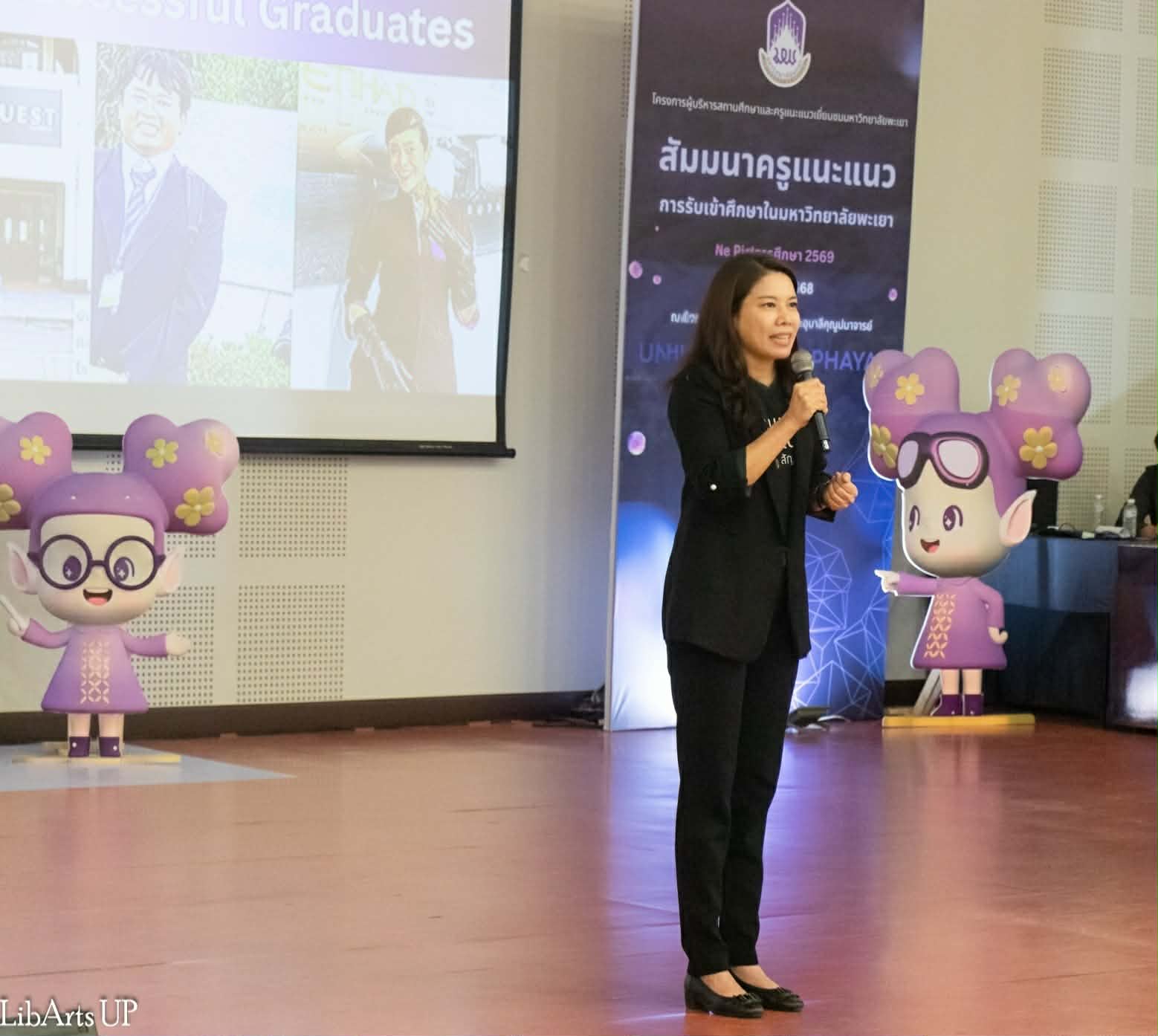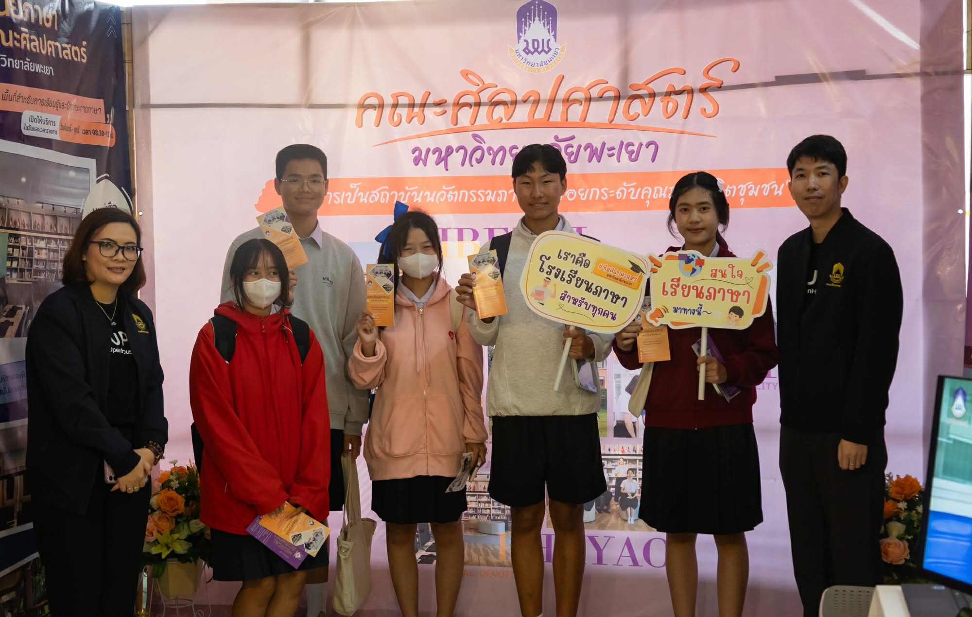 วันศุกร์ที่ 12 ธันวาคม 2568 มหาวิทยาลัยพะเยา โดยกองบริการการศึกษา จัดกิจกรรม UP Open House 2026 ภายใต้ โครงการผู้บริหารสถานศึกษาและครูแนะแนวเยี่ยมชมมหาวิทยาลัยพะเยา โดยมี รองศาสตราจารย์ ดร.สุภกร พงศบางโพธิ์ อธิการบดีมหาวิทยาลัยพะเยา นำทีมผู้บริหาร คณาจารย์ และบุคลากร ร่วมให้การต้อนรับผู้บริหารสถานศึกษา ครูแนะแนว และนักเรียนจากจังหวัดพะเยาและจังหวัดใกล้เคียง ซึ่งให้ความสนใจเข้าร่วมงานกว่า 700 คน ในโอกาสนี้ คณะศิลปศาสตร์ นำโดย ผู้ช่วยศาสตราจารย์ ดร.จิตติมา กาวีระ คณบดีคณะศิลปศาสตร์ และ ดร.เบญจพร เทพสีหนู ผู้ช่วยคณบดีฝ่ายวิชาการ พร้อมด้วยบุคลากรงานวิชาการ ได้แก่ นางสาวสุภาพร คำรส นางสาวไพลิน วงศ์ไชย และนายสถาพร เทพอุดม ได้ร่วมประชาสัมพันธ์และนำเสนอจุดเด่นของหลักสูตร โดยมุ่งเน้นการพัฒนาบัณฑิตให้มี Global Mindset และสมรรถนะด้านภาษา เพื่อตอบโจทย์การทำงานในโลกอนาคต ผ่านปัจจัยสำคัญดังนี้