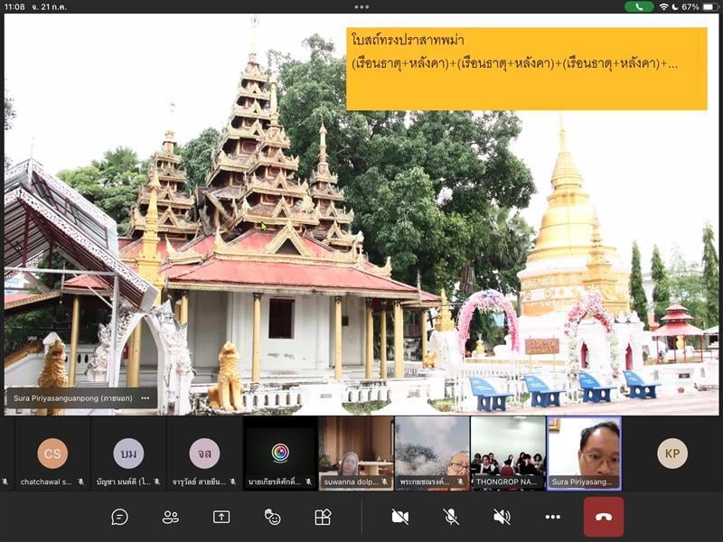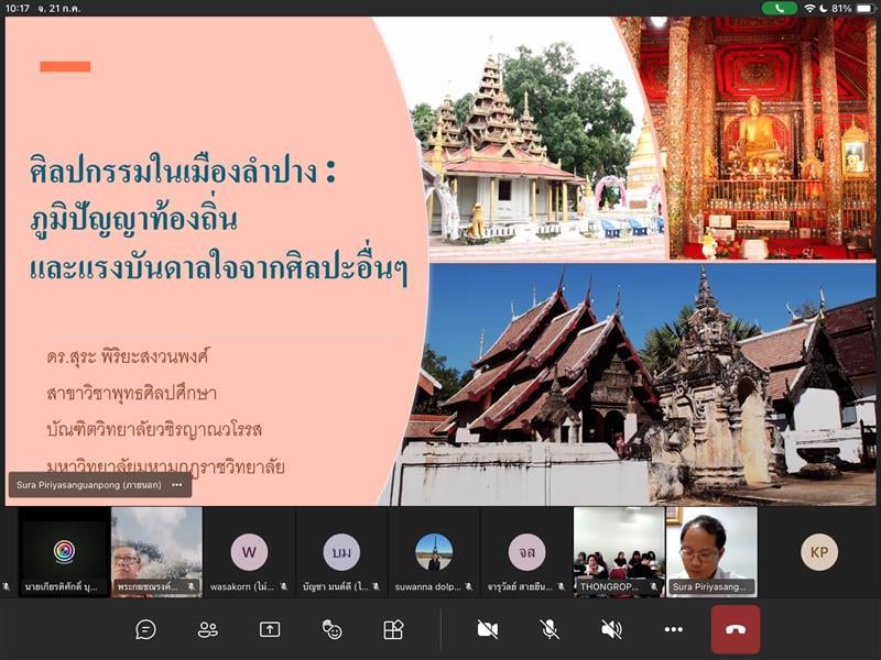 สำหรับกิจกรรมนี้ เป็นกิจกรรมย่อยที่ 2 การอบรมพัฒนาทักษะ หัวข้อ “ประติมานวิทยาในพุทธศิลป์” และ “ศิลปกรรมในเมืองลำปาง: ภูมิปัญญาท้องถิ่นและแรงบันดาลใจจากศิลปะอื่น ๆ" ซึ่งได้รับเกียรติจาก ดร.สุระ พิริยะสงวนพงศ์ อาจารย์ประจำหลักสูตรพุทธศิลป์ศึกษา มหาวิทยาลัยมหามกุฏราชวิทยาลัย ผู้เชี่ยวชาญด้านประวัติศาสตร์ศิลปะไทย-พม่า เป็นวิทยากรบรรยายผ่านระบบออนไลน์ Ms Teams โดยมีวัตถุประสงค์เพื่อให้ผู้เข้าอบรมได้รับความรู้ด้านพุทธศิลป์และประวัติศาสตร์ศิลปะ และเพื่อเตรียมความพร้อมสำหรับนิสิตหลักสูตร ศศ.บ. ภาษาฝรั่งเศส และ ศศ.บ. ภาษาฝรั่งเศสและภาษาอังกฤษ ในรายวิชา 145461 ภาษาฝรั่งเศสสำหรับงานมัคคุเทศก์ ก่อนออกฝึกปฏิบัติมัคคุเทศก์ภาษาฝรั่งเศส ณ จังหวัดลำปาง ในวันที่ 16-17 สิงหาคม 2568