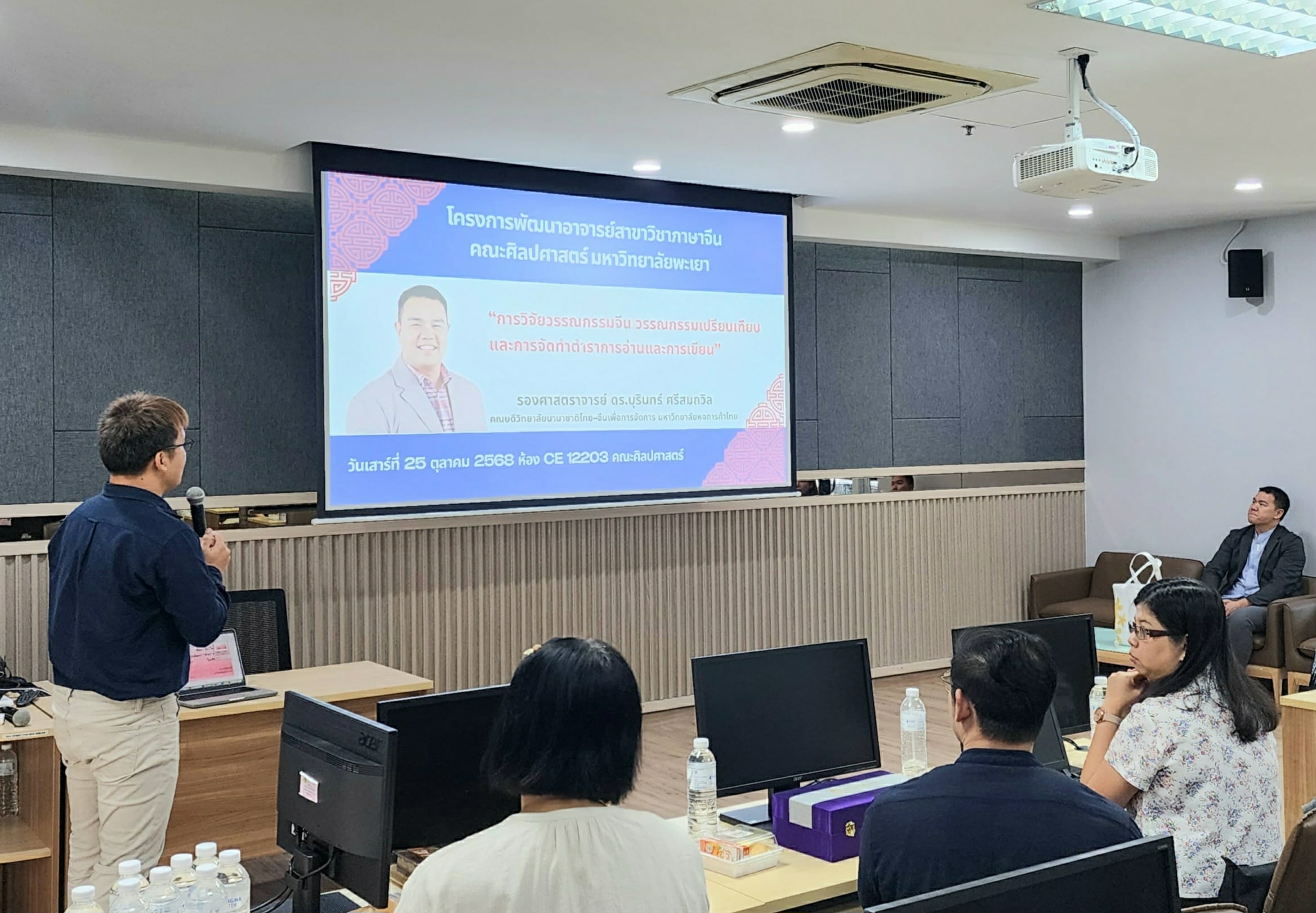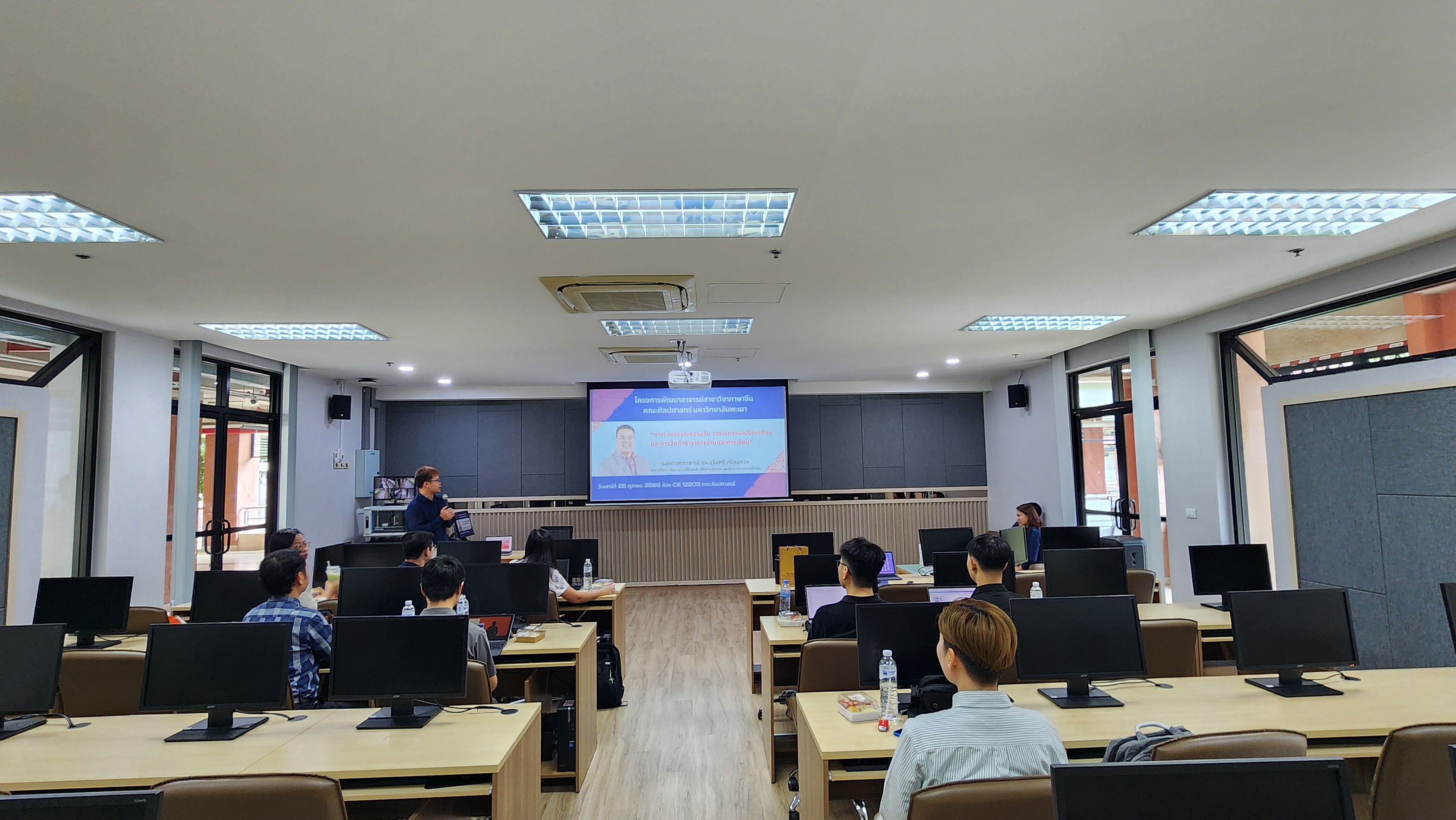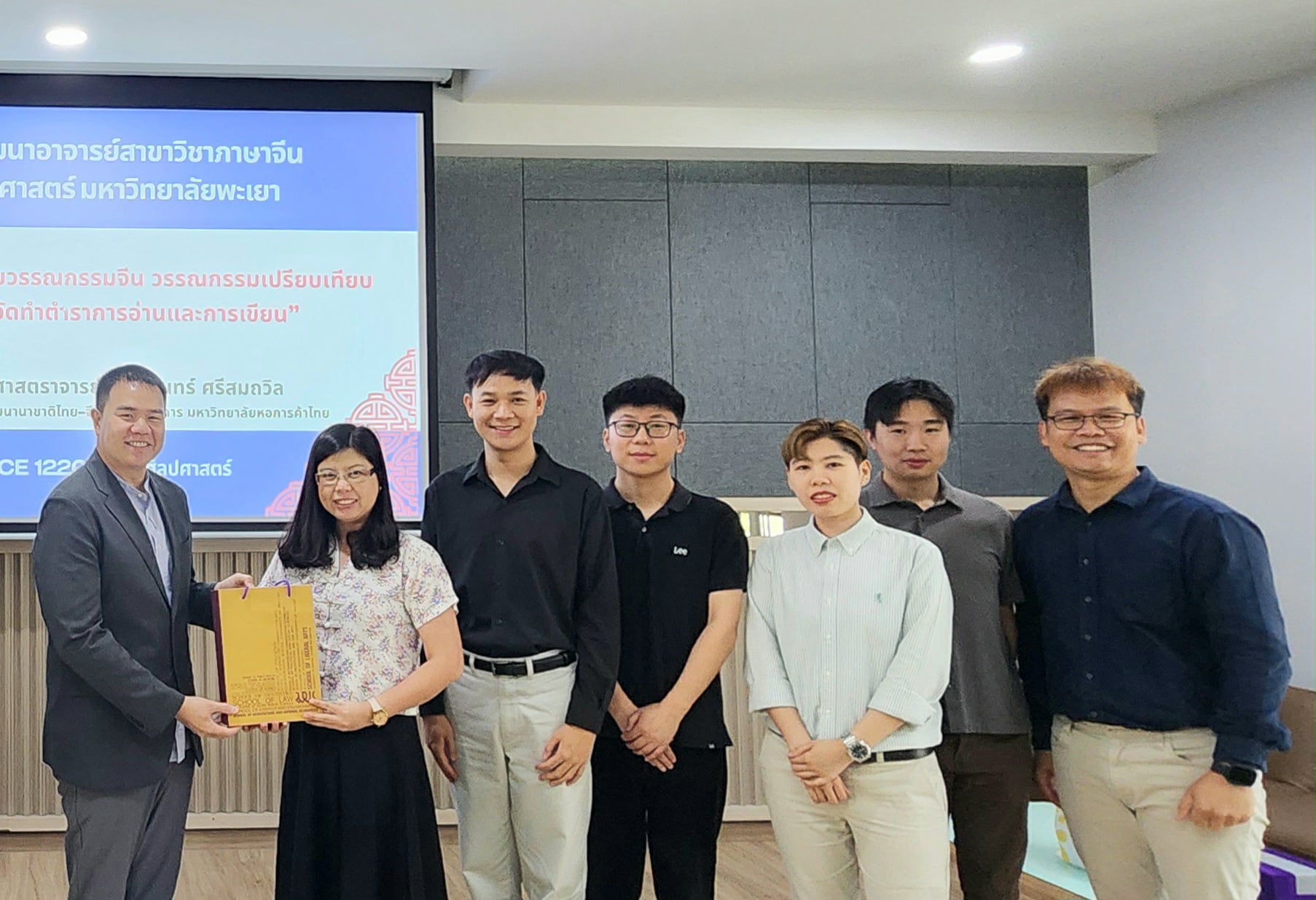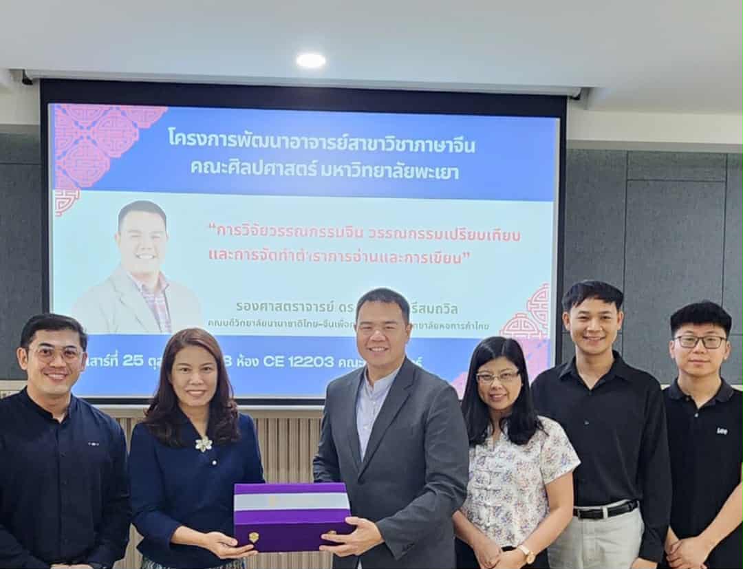 วันที่ 25 ตุลาคม 2568 สาขาวิชาภาษาจีน คณะศิลปศาสตร์ มหาวิทยาลัยพะเยา ให้การต้อนรับ รองศาสตราจารย์ ดร.บุรินทร์ ศรีสมถวิล คณบดีวิทยาลัยนานาชาติไทย–จีน เพื่อการจัดการ มหาวิทยาลัยหอการค้าไทย ซึ่งให้เกียรติมาบรรยายและถ่ายทอดองค์ความรู้ในหัวข้อ “การวิจัยวรรณกรรมจีน วรรณกรรมเปรียบเทียบ และการจัดทำตำราการอ่านและการเขียน” แก่คณาจารย์สาขาวิชาภาษาจีน คณะศิลปศาสตร์ มหาวิทยาลัยพะเยา โดยการบรรยายในครั้งนี้ มีวัตถุประสงค์เพื่อเสริมสร้างความรู้ด้านการวิจัยและพัฒนาการเรียนการสอนภาษาจีนให้กับคณาจารย์ ตลอดจนเป็นเวทีแลกเปลี่ยนประสบการณ์ทางวิชาการระหว่างสองสถาบัน อันจะนำไปสู่ความร่วมมือทางวิชาการในอนาคต