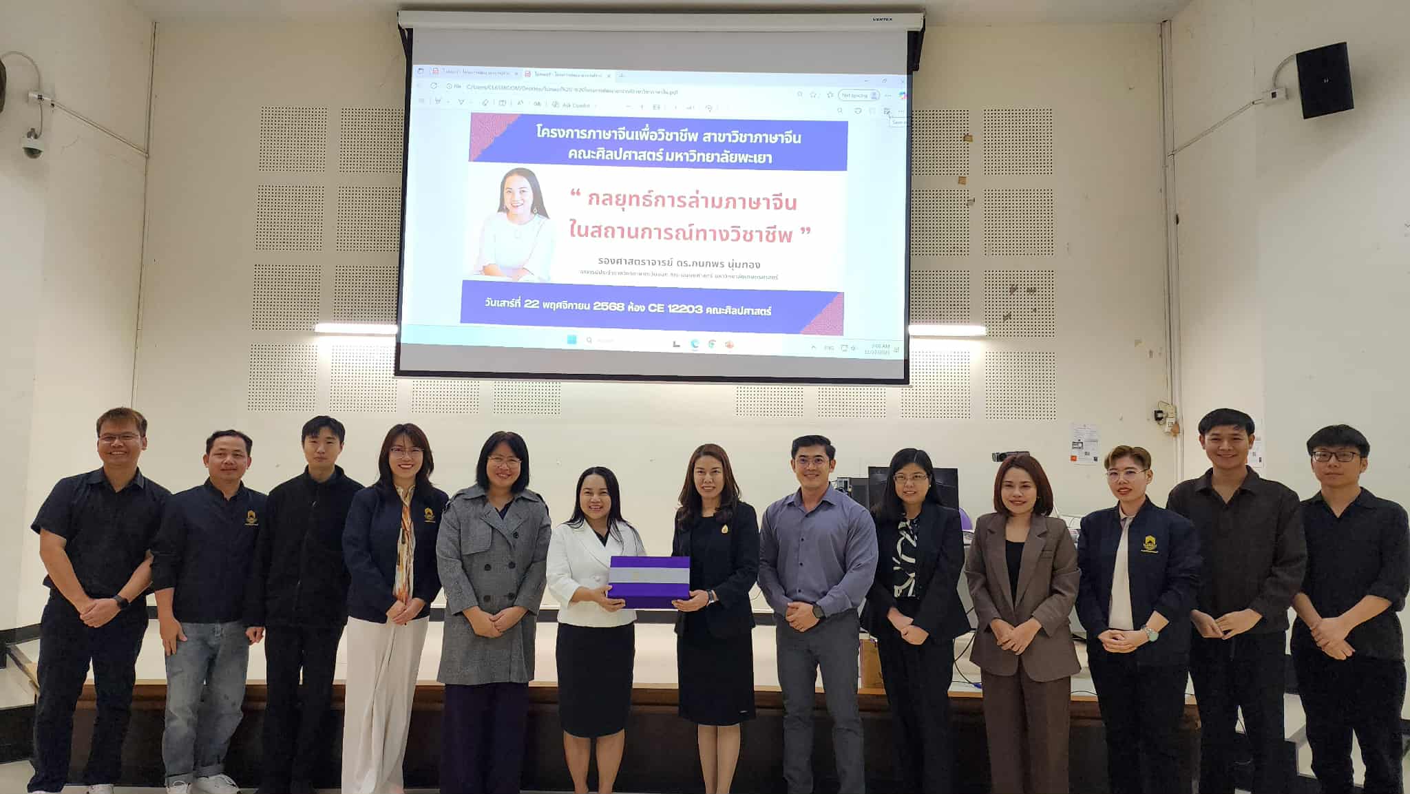สาขาวิชาภาษาจีน คณะศิลปศาสตร์ มหาวิทยาลัยพะเยา จัดโครงการภาษาจีนเพื่อวิชาชีพ ประจำปีงบประมาณ 2569 “กลยุทธ์การล่ามภาษาจีนในสถานการณ์ทางวิชาชีพ” เพื่อส่งเสริมความสามารถด้านการล่ามและการสื่อสารเชิงวิชาชีพ อันเป็นทักษะสำคัญสำหรับการทำงานในบริบทสากล โครงการดังกล่าวฯ นำโดย ผู้ช่วยศาสตราจารย์ ดร.สุภัทรา โยธินสิริกุล ประธานหลักสูตรศิลปศาสตรบัณฑิต สาขาวิชาภาษาจีน และผู้รับผิดชอบโครงการคือ ผู้ช่วยศาสตราจารย์ ดร.ธิวานนท์ พูพวก โดยได้รับเกียรติจาก รองศาสตราจารย์ ดร.กนกพร นุ่มทอง ผู้เชี่ยวชาญด้านการล่ามและการสอนภาษาจีน จากคณะมนุษยศาสตร์ มหาวิทยาลัยเกษตรศาสตร์ มาเป็นวิทยากรบรรยายพิเศษ