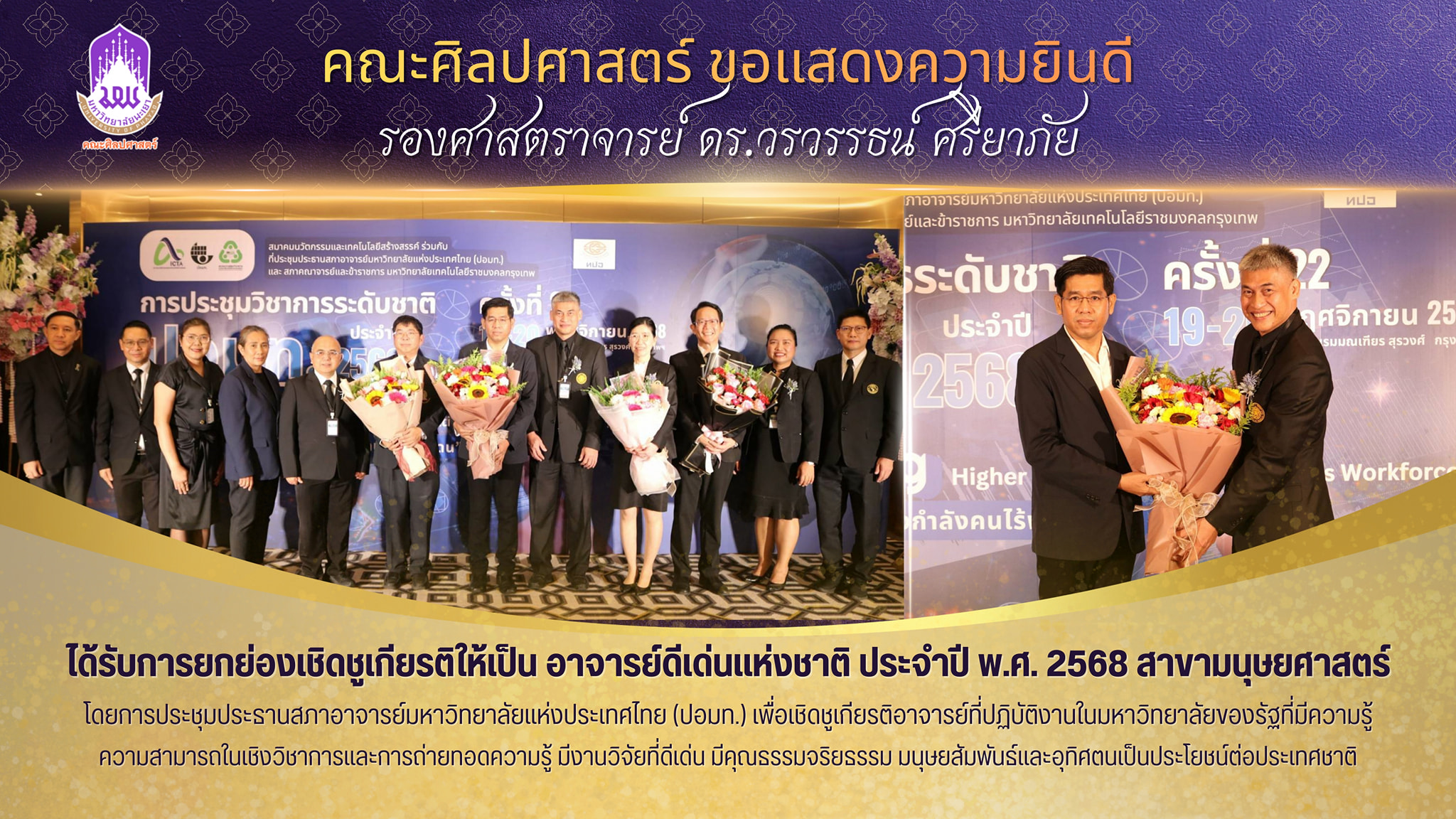 มหาวิทยาลัยพะเยาร่วมแสดงความยินดีกับ รศ.ดร.วรวรรธน์ ศรียาภัย ที่ได้รับการเชิดชูเกียรติ์ให้เป็น อาจารย์ดีเด่นแห่งชาติ ประจำปี พ.ศ. 2568 สาขามนุษยศาสตร์