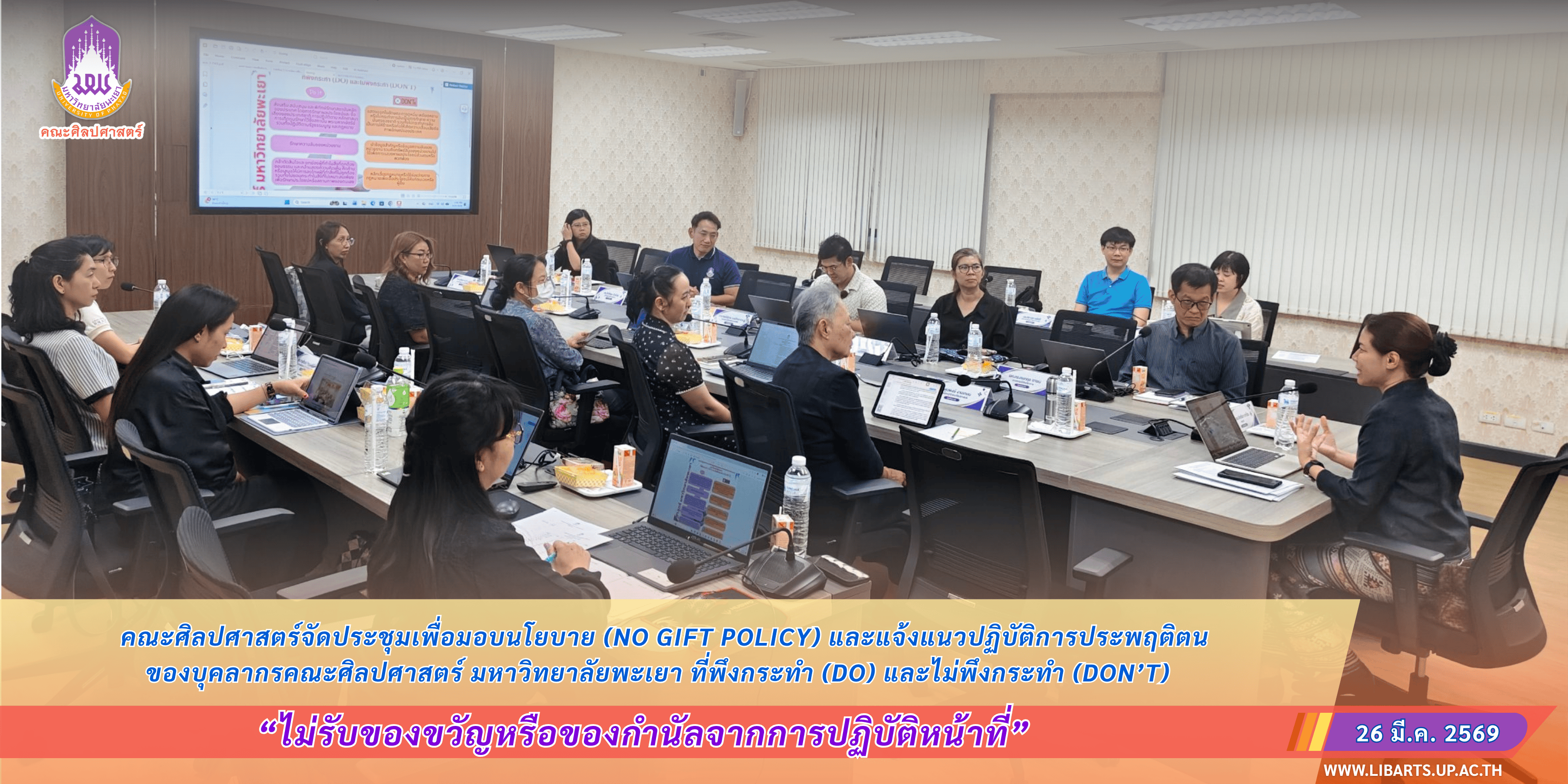 เมื่อวันพฤหัสบดีที่ 26 มีนาคม 2569 คณะศิลปศาสตร์ได้ดำเนินการประชุมคณะกรรมการประจำคณะศิลปศาสตร์ ครั้งที่ 3/2569 ณ ห้องประชุมคณะศิลปศาสตร์ โดย ผู้ช่วยศาสตราจารย์ ดร.จิตติมา กาวีระ คณบดีคณะศิลปศาสตร์ ได้แสดงเจตจำนงการบริหารงาน การประกาศนโยบายไม่รับของขวัญหรือของกำนัลจากการปฏิบัติหน้าที่ (No Gift Policy) เพื่อสร้างการรับรู้และความเข้าใจ ให้กับคณะผู้บริหาร ประธานหลักสูตร และบุคลากรคณะศิลปศาสตร์ ตลอดจนเพื่อสร้างความโปร่งใสภายในหน่วยงาน สร้างค่านิยมในการปฏิบัติหน้าที่ และพึงปฏิบัติให้เป็นวัฒนธรรมสุจริตขององค์กร รวมถึงแจ้งแนวปฏิบัติการประพฤติตนของบุคลากรคณะศิลปศาสตร์ มหาวิทยาลัยพะเยาที่พึงกระทำ และ ไม่พึงกระทำ ตามมาตรฐานทางจริยธรรมสำหรับเจ้าหน้าที่ของรัฐ ที่กำหนดในพระราชบัญญัติมาตรฐานทางจริยธรรม พ.ศ. 2562 ความว่า